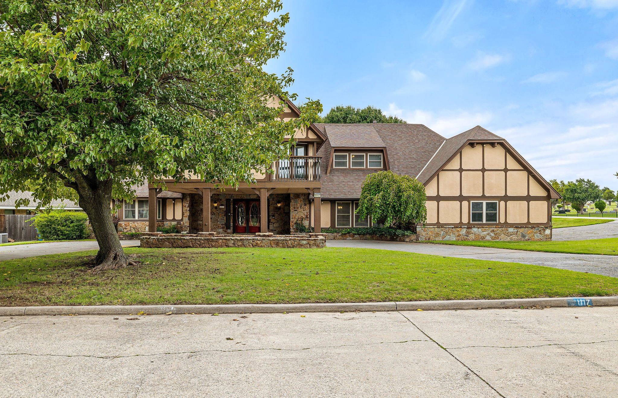 Say hello to this well-loved and beautifully maintained home is ready to welcome its next owners. Offering 4 bedrooms, 2.5 bathrooms, and 3,299 square feet of living space, it sits on a spacious corner lot in a highly sought-after neighborhood. Step through the double doors into a warm and inviting living space that features a wet bar, making it the perfect gathering spot for family and friends. Just off the entry, a versatile bonus room provides endless possibilities—it can serve as a cozy den, home office, craft room, or even a fifth bedroom. Across the entry, the formal dining room is lined with large windows that flood the space with natural light, creating an ideal setting for dinners and celebrations. The kitchen is both functional and welcoming, with stainless steel appliances, ample counter space, and an eat-in dining area that overlooks the backyard. Upstairs, four bedrooms provide comfort and privacy. Two guest rooms share a Jack-and-Jill layout, highlighted by a striking black soaker tub and accented with stained-glass windows for a touch of elegance. One guest room also opens to a private balcony with views of the backyard. The primary suite is generously sized, offering an en-suite bathroom and access to a second balcony—an ideal spot to enjoy your morning coffee or unwind at the end of the day. Outdoors, the backyard is shaded by mature trees and provides plenty of room for entertaining, gardening, or play. The oversized garage includes an in-ground storm shelter for peace of mind. Blending character, space, and thoughtful details, this home is a rare find in a well-established community and is ready for its next chapter.